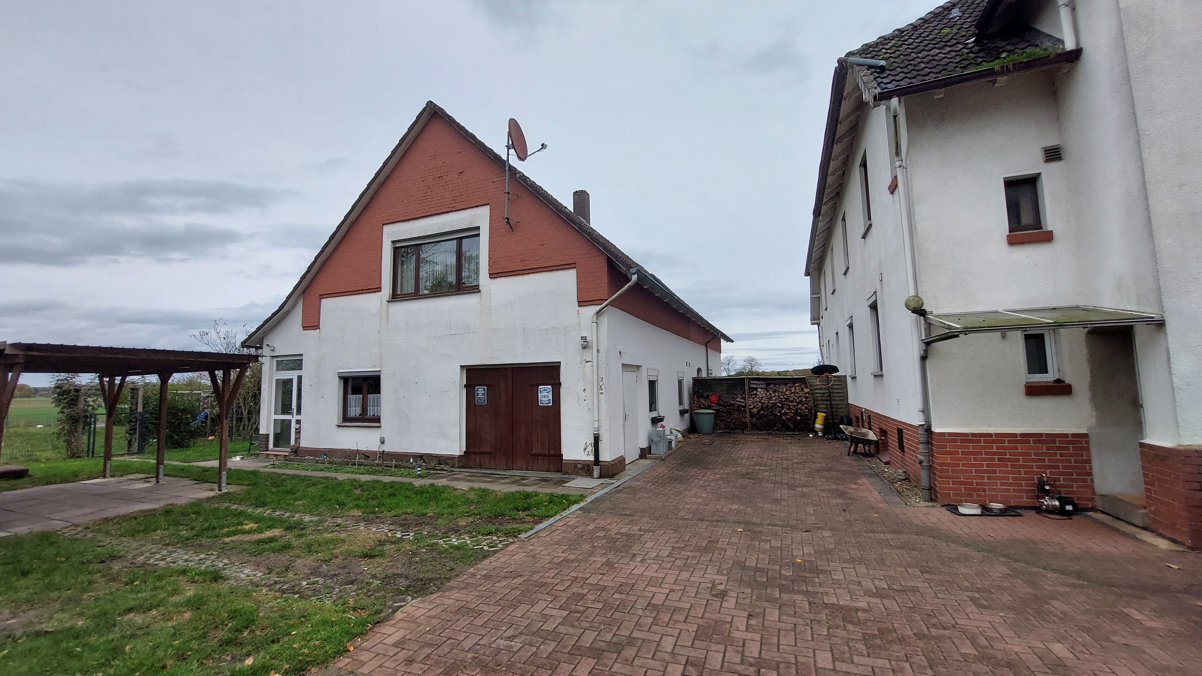 Eine Garage und ein anschließender Lagerraum sind in das Gästehaus integriert. Die große Hoffläche bietet gepflasterte Stellflächen für weitere Fahrzeuge.