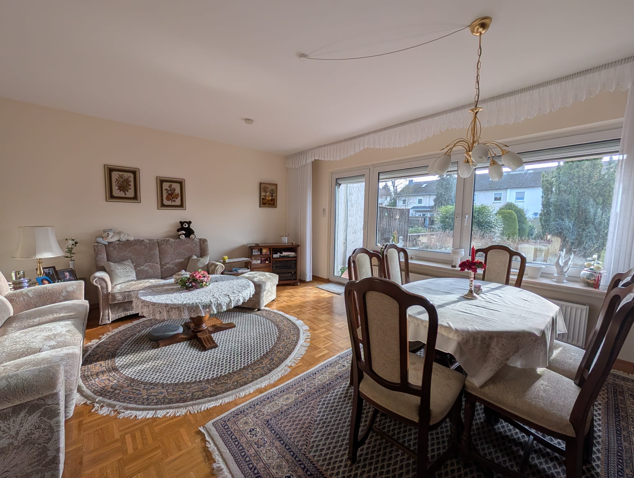Im Erdgeschoss befinden sich ein Gäste-WC mit Fenster, die Küche und ein gut geschnittenes Wohnzimmer. Das Wohnzimmer kann in einen Wohn- und Essbereich aufgeteilt werden, von dem Sie immer einen direkten Blick in den Garten haben.