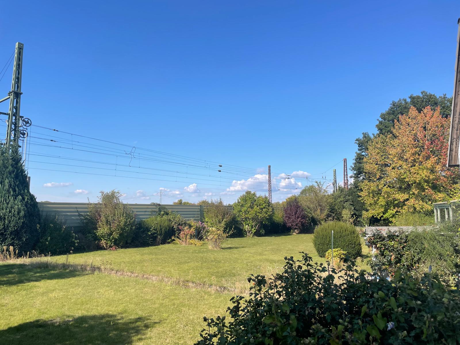 Das Grundstück grenzt rückseitig an eine Bahnlinie, die durch eine Schallschutzwand vom Garten getrennt ist. Diese Lage bietet eine gute Verkehrsanbindung, erfordert jedoch eine gewisse Toleranz gegenüber gelegentlichen Geräuschen vorbeifahrender Züge. Die weitgehend unbebaute Gartenfläche bietet dennoch viel Platz für individuelle Gestaltung und Erholung im Freien.