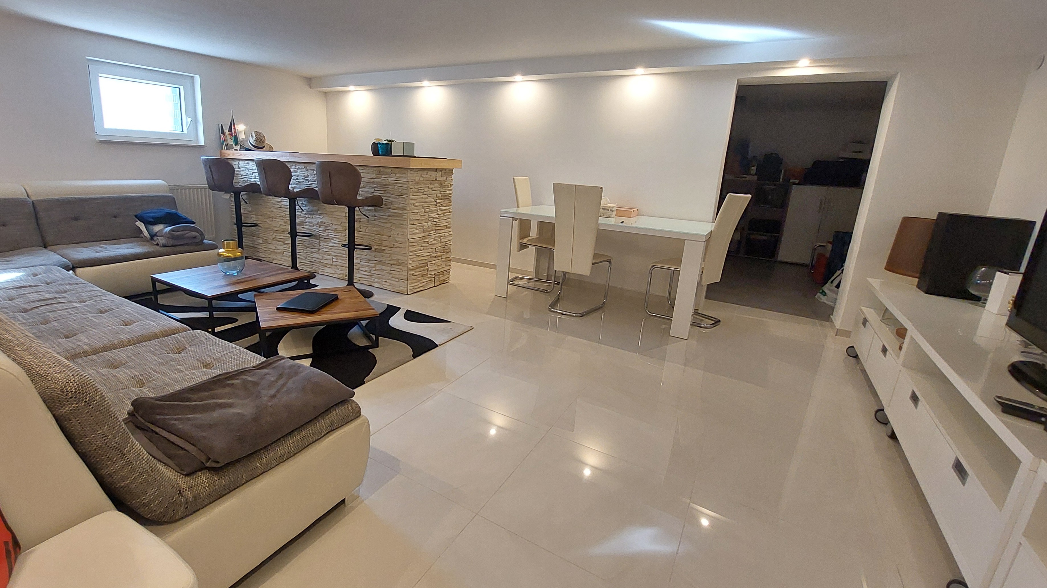 Der Keller besticht durch seine gefühlte Wohnraumerweiterung. Hier finden Sie eine ausgebaute Gästewohnung mit Wohnraum, Schlafzimmer und mit vollwertigem Badezimmer. Zusätzlich stehen auch Lagerräume mit ausreichend Nutzfläche für Stauraum zur Verfügung. Ein direkter Ausgang auf den Hof rundet das Angebot ab.