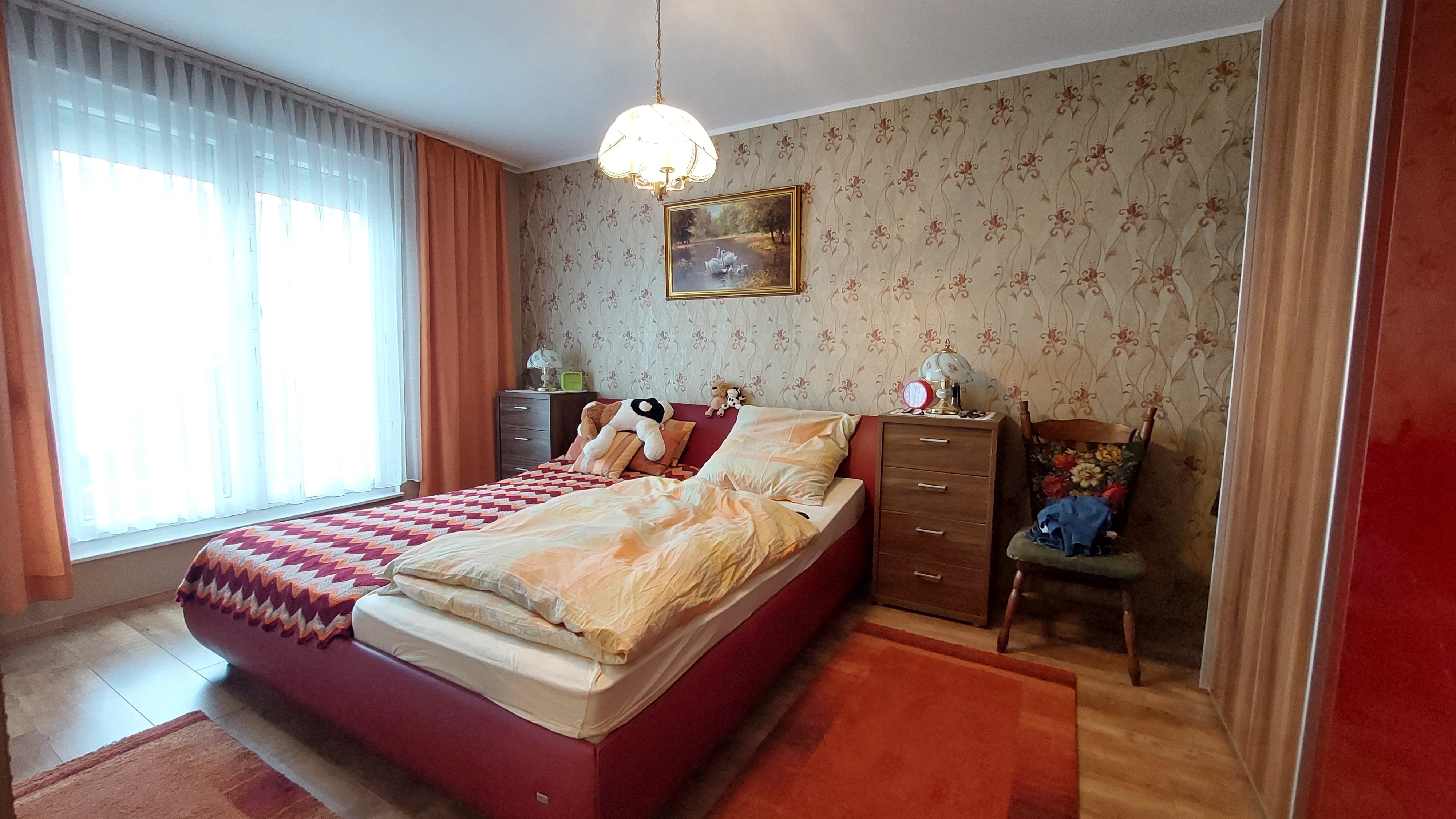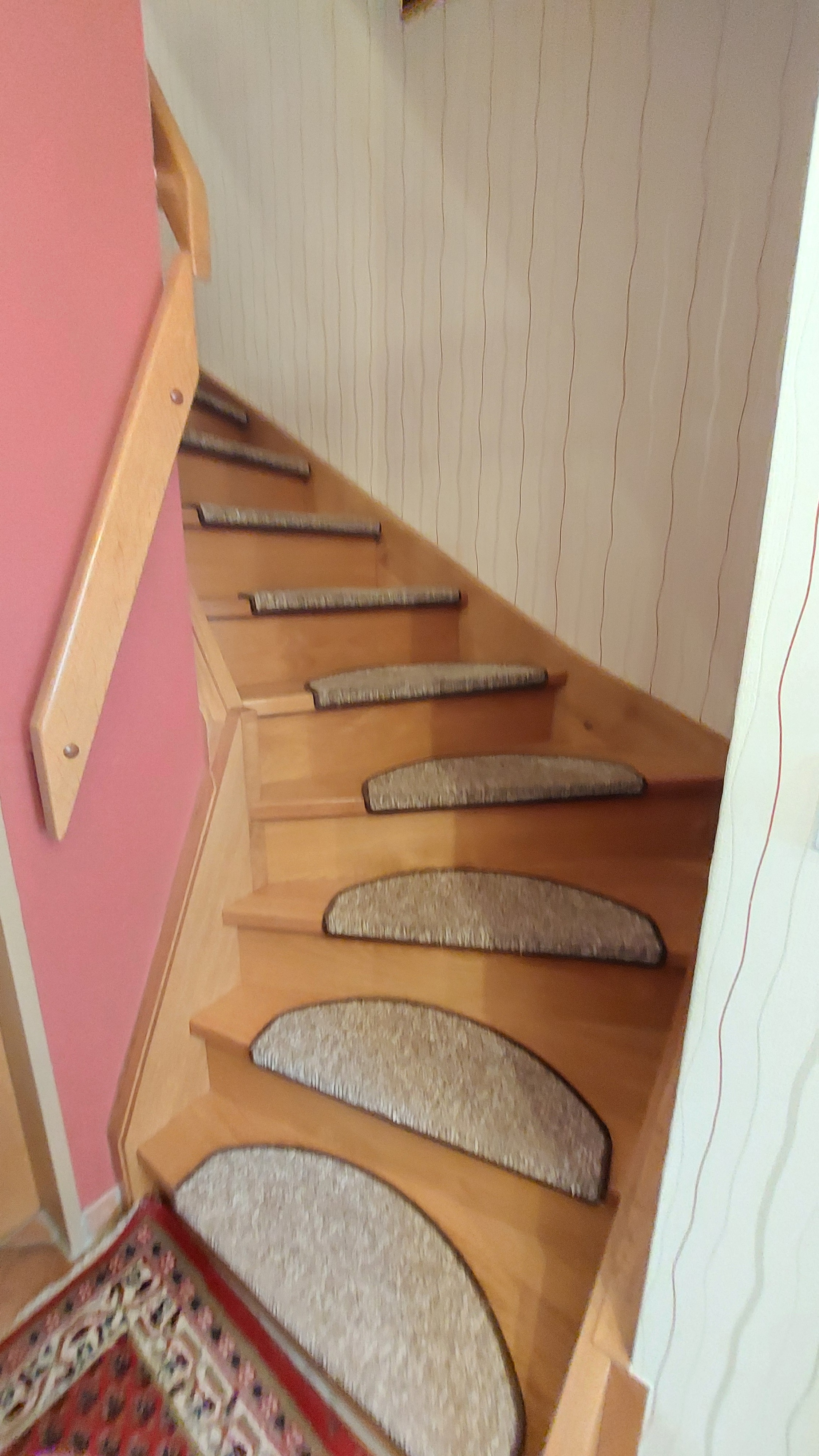 Eine helle Holztreppe führt ins Obergeschoss, zu drei gut geschnittenen Zimmern, die vielseitig nutzbar sind – ob als Schlaf-, Kinder- oder Arbeitszimmer. Der Flur verbindet die Räume mit dem Badezimmer, das mit einer Badewanne, einer Dusche und einem Fenster ausgestattet ist.