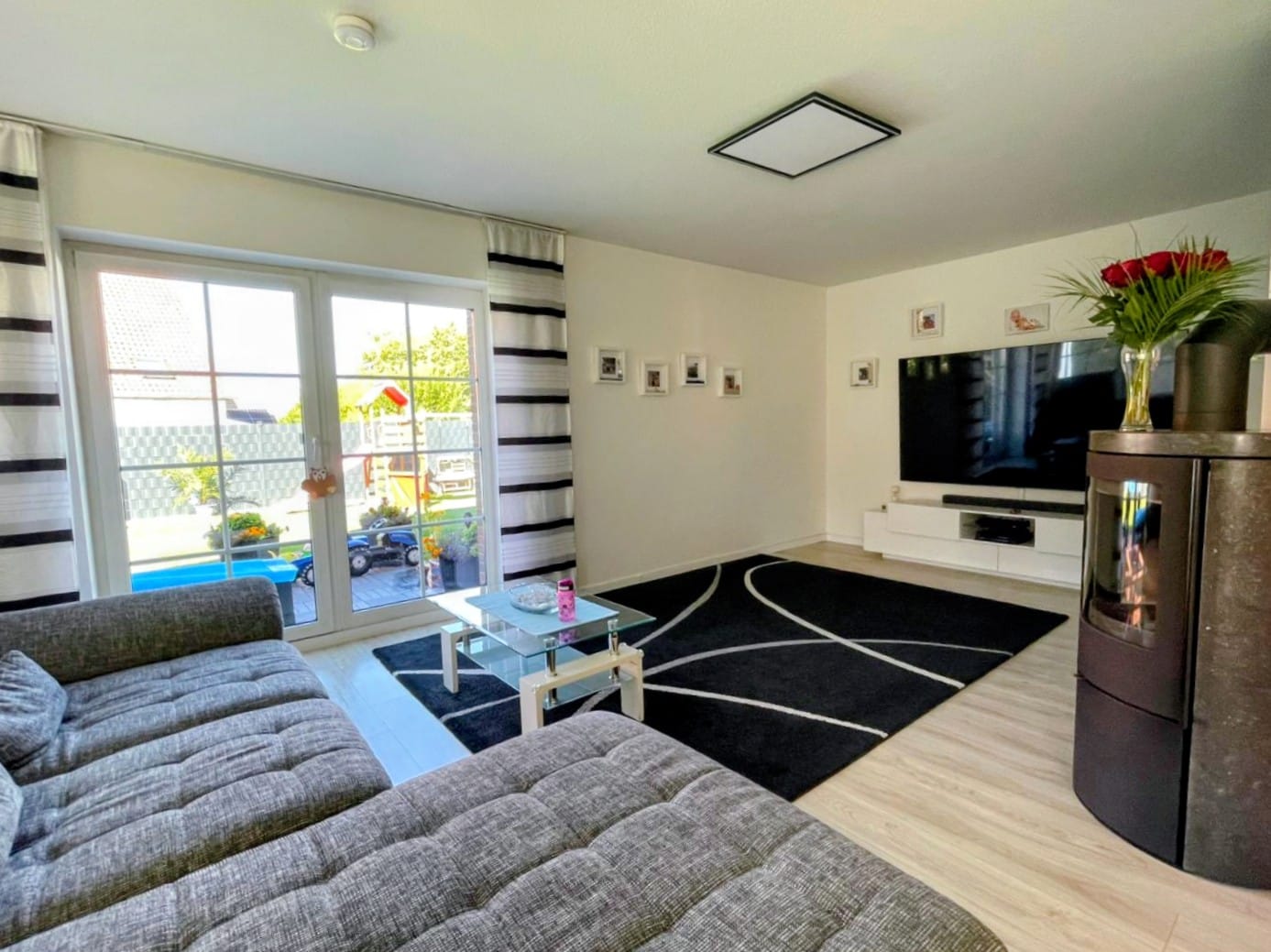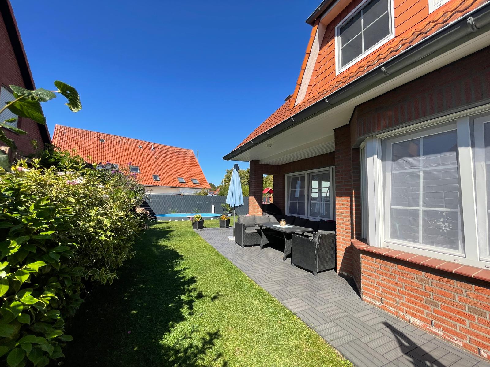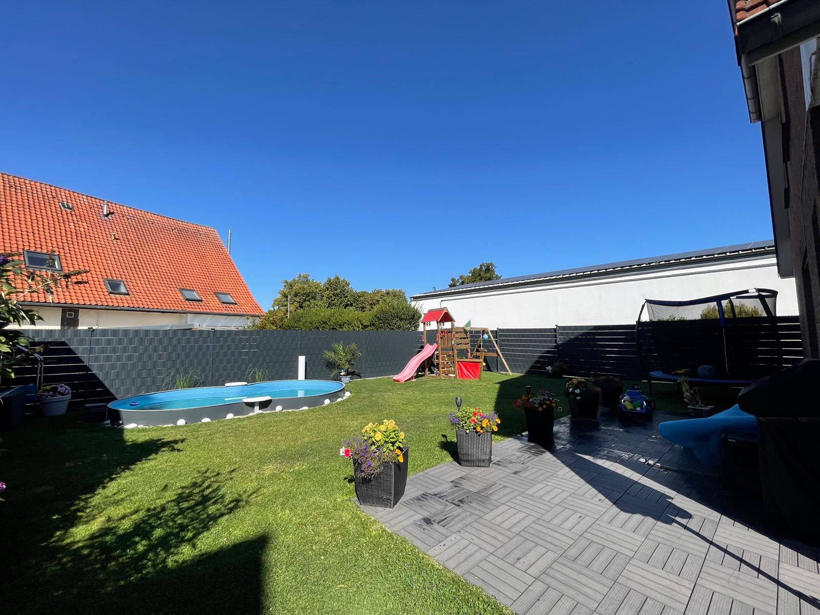 Die nach Süden und Osten ausgerichtete Terrasse ist sowohl vom Wohnzimmer als auch von der Küche zugänglich. Der Garten bietet vielfältige Möglichkeiten – vom eigenen Pool über verschiedene Sitzbereiche bis hin zu Spielmöglichkeiten für Kinder. Eine Garage am Grundstück sorgt für bequemes Parken, während der angrenzende Geräteschuppen Platz für Fahrräder und Holzlager bietet.