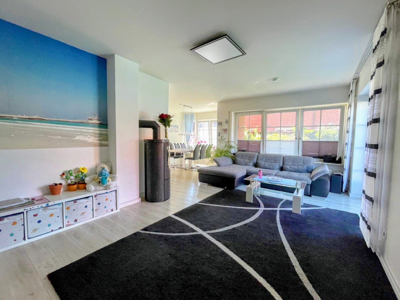 Im Erdgeschoss erwartet Sie ein großzügiger Wohn- und Essbereich mit gemütlichem Kamin. Die moderne Nolte-Einbauküche überzeugt durch hochwertige Materialien und durchdachtes Design. Praktisch angrenzend befindet sich ein Hauswirtschaftsraum mit Waschmaschinenanschluss, der kurze Wege im Alltag garantiert. Unter der Treppe sorgt eine clevere Nische für zusätzlichen Stauraum. Abgerundet wird das Raumangebot durch ein helles Gäste-WC.